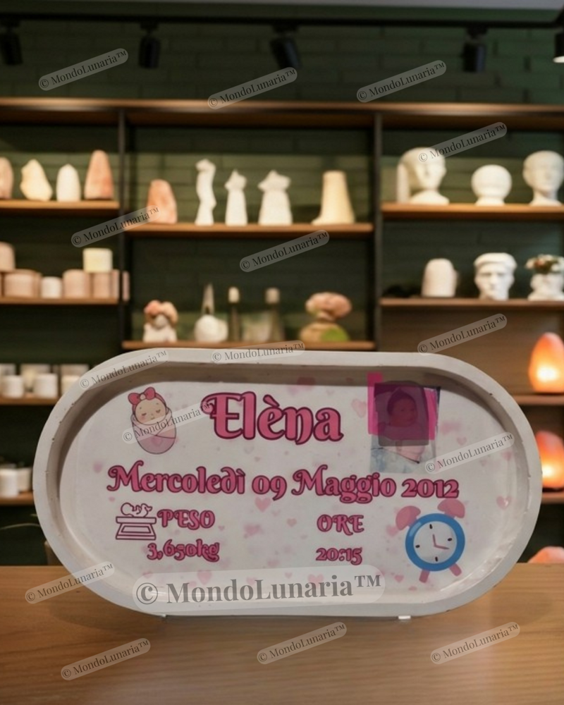 Questo delicato vassoio nascita è pensato per custodire piccoli oggetti speciali o per diventare un dolce ricordo da esporre nella cameretta.